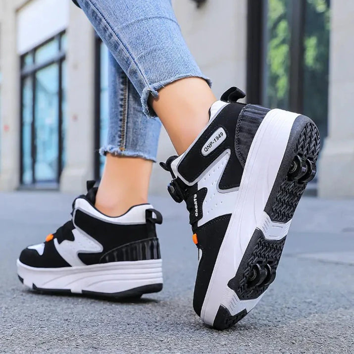 Answer 2: The shoes feature a state-of-the-art four-wheel roller system that allows for smooth gliding. The wheels can be easily folded away when walking, enabling a seamless transition between skating and walking in just moments.